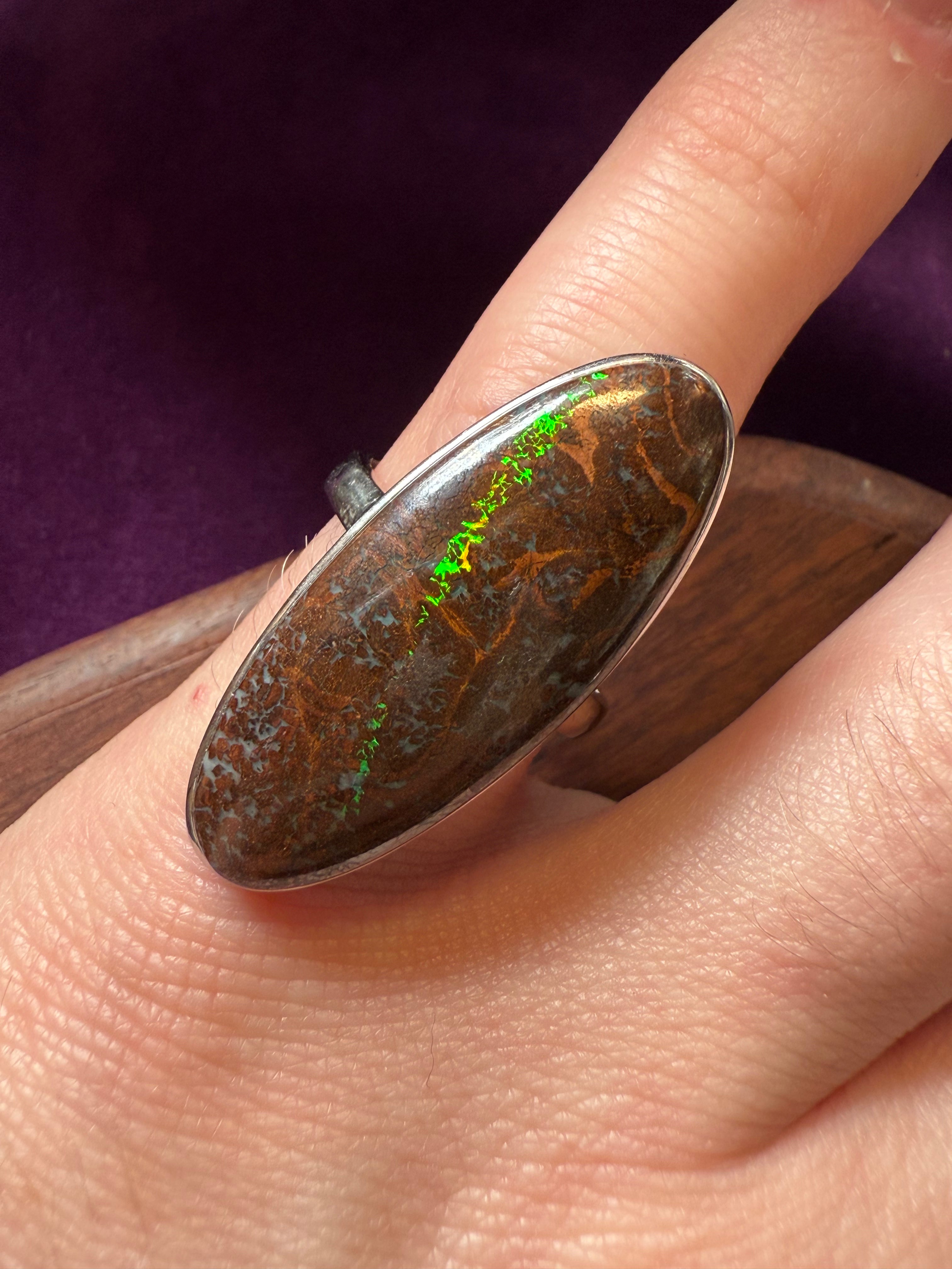 Found in the rugged opal fields of Queensland, Australia, this Boulder Opal ring captures the raw beauty of the Outback. In Boulder Opal, veins of vivid opal flash are naturally embedded in their host ironstone, creating a striking contrast of earthy browns and electric blues, greens, purples, and sometimes fiery reds.