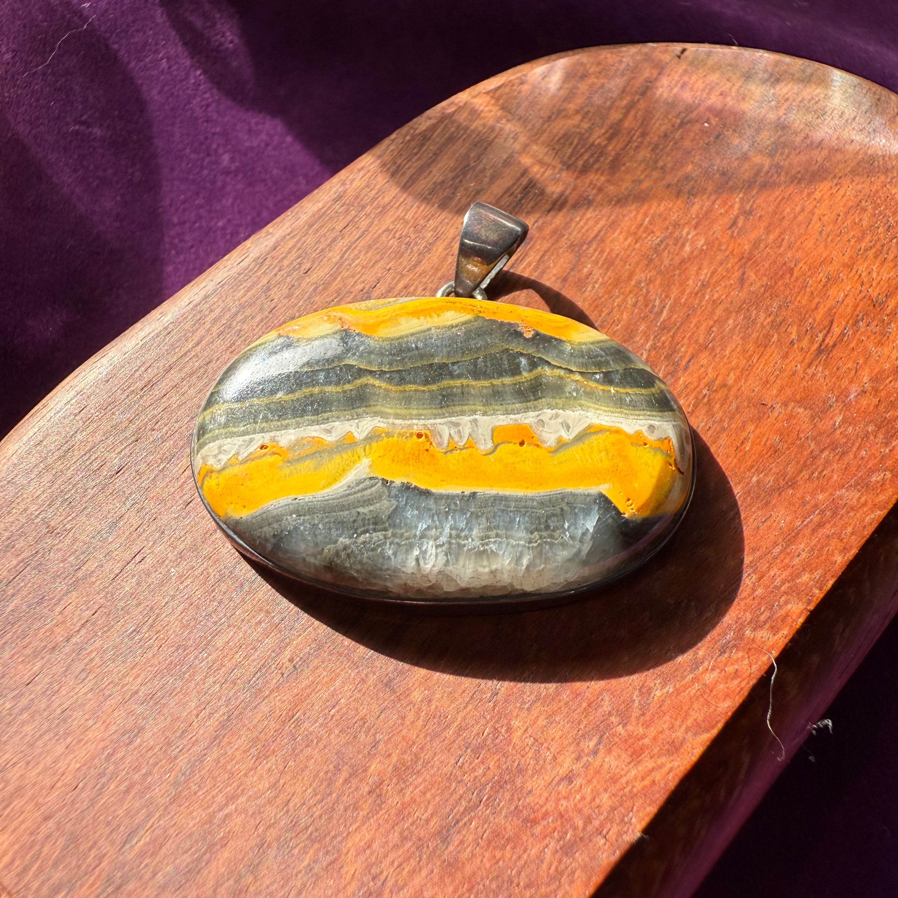 Formed in the heart of an active volcano in Indonesia, Bumblebee Jasper is as dramatic as its origin story. With striking bands of gold, yellow, black, and grey, it’s a gemstone that looks like it was painted by nature herself. Despite its name, it’s not a true jasper but a rare mix of volcanic minerals, including sulfur, hematite, and arsenic compounds, giving it its bold coloration.