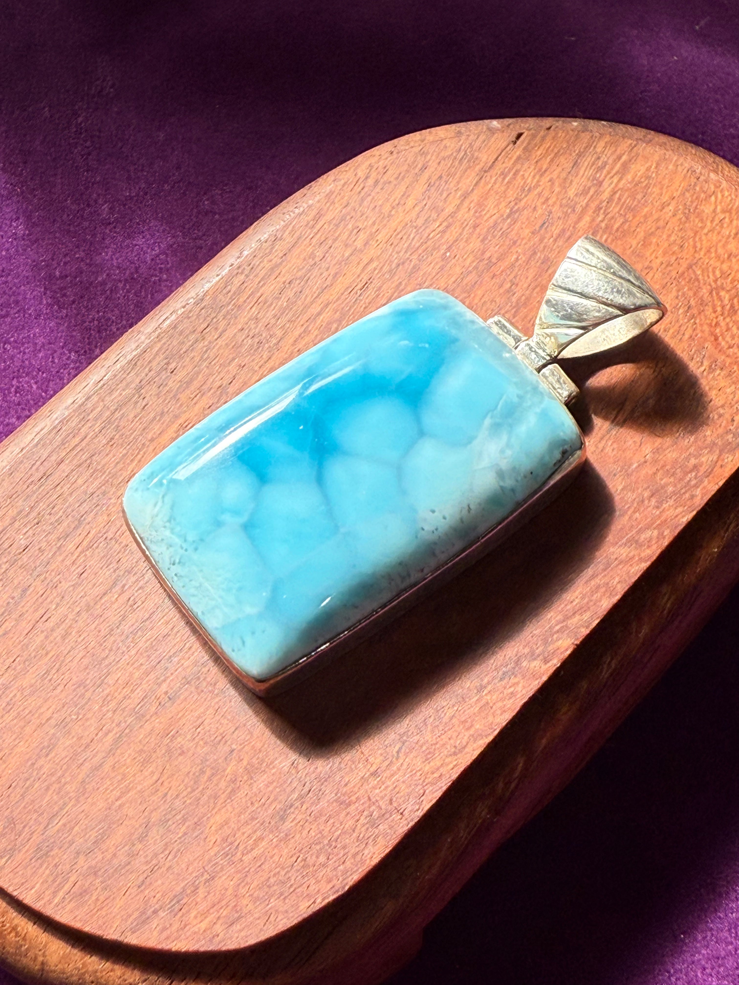 That same energy lives inside this high-grade Larimar pendant, mined exclusively from the volcanic mountains of the Dominican Republic — the only place on Earth where this rare gemstone exists.