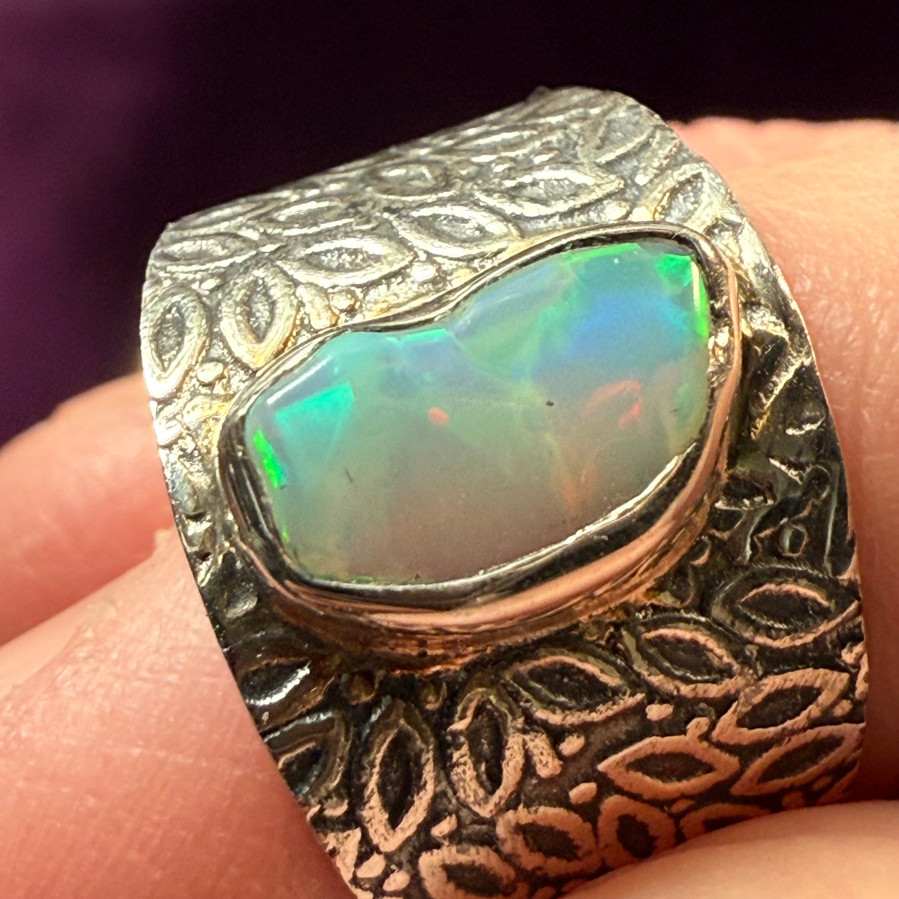 From Ethiopia’s famed Welo deposits, this opal bursts with bright green fire, accented by flashes of red, pink, and orange. The handworked sterling silver setting features an intricate leafy design that wraps around the band, giving the piece an organic elegance.